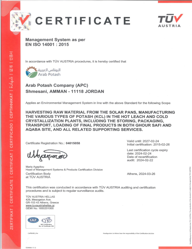 • ISO 14001:2015: APC's sustainable environmental management system resulted in obtaining ISO 14001:2015 certification.