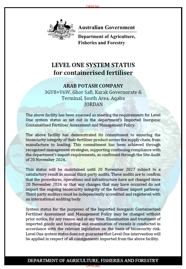 • Australian Quarantine and Inspection Service (AQIS): APC follows the Australian Quarantine and Inspection Service protocol, ensuring compliance through external audits of logistics operations at our factory and Aqaba sites. This certification confirms ongoing adherence to the required standards.