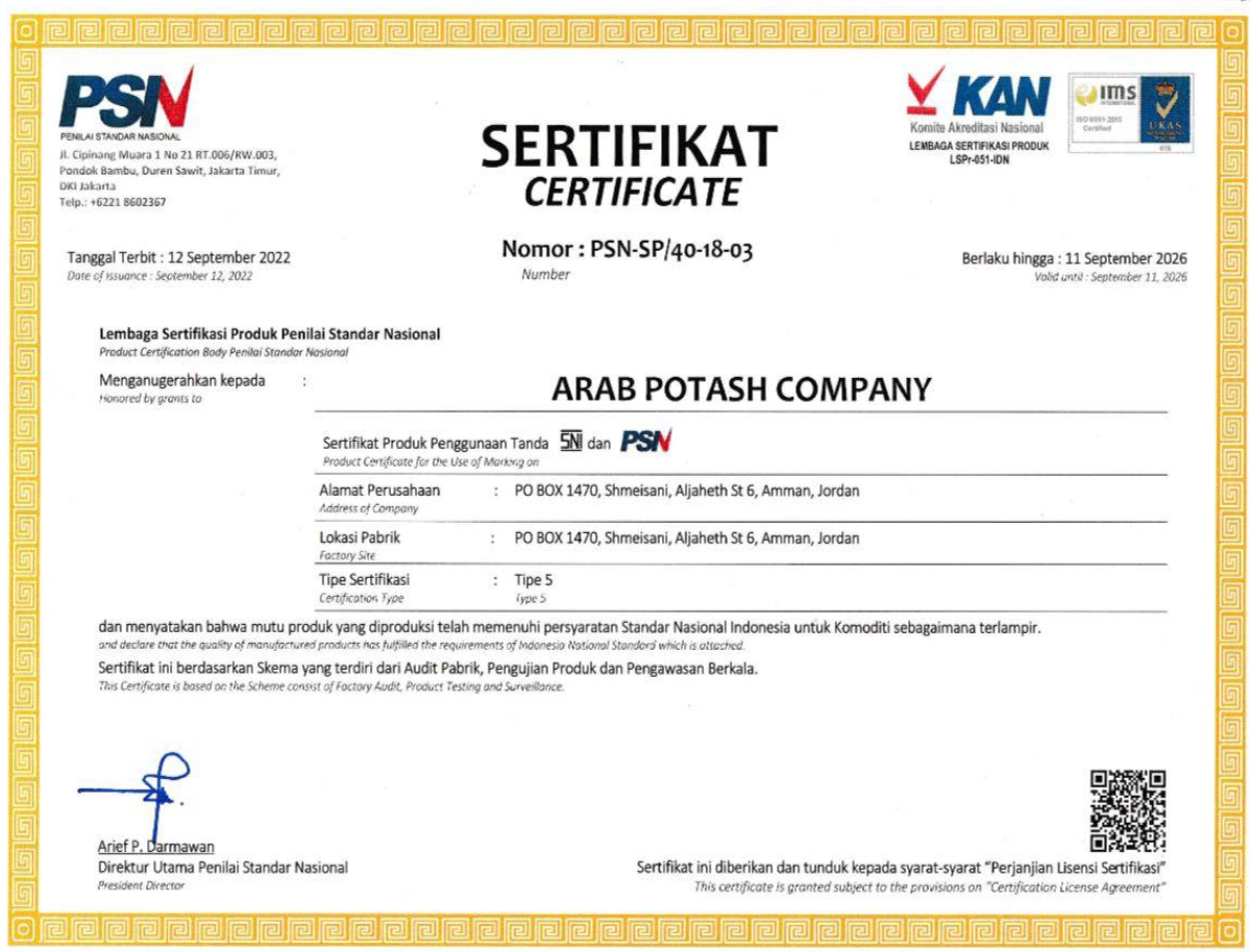 • Standard Nasional Indonesia (SNI): APC has maintained its commitment to the quality standards set by the Indonesian authorities, securing a certificate of conformity with these requirements.