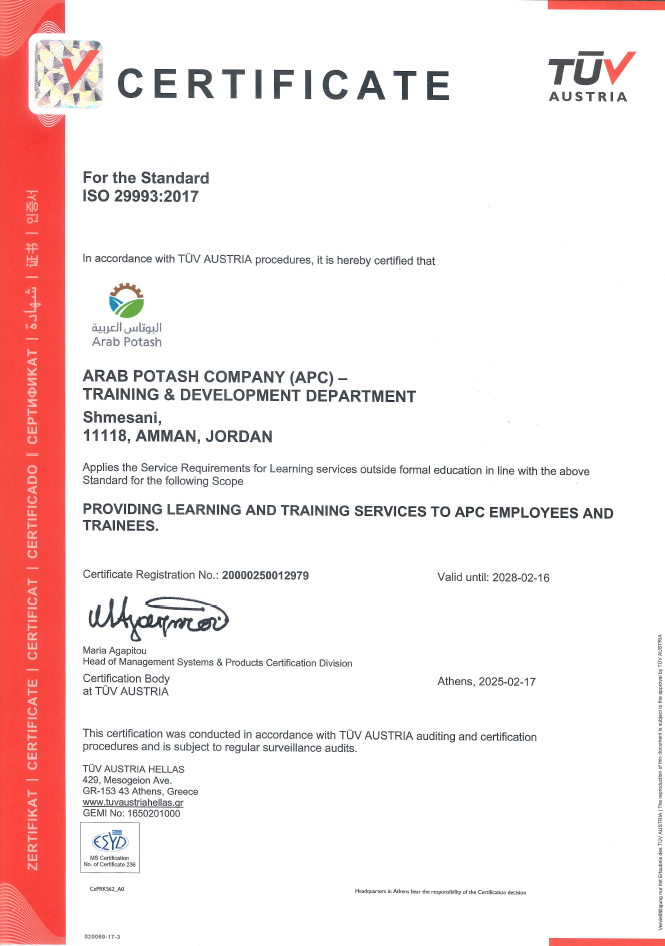 • ISO 29993:2017: APC achieved compliance with the ISO 29993:2017 by implementing a learning quality management system in 2024, committing to a systematic approach that ensures delivering high-quality learning experiences for employees and trainees.