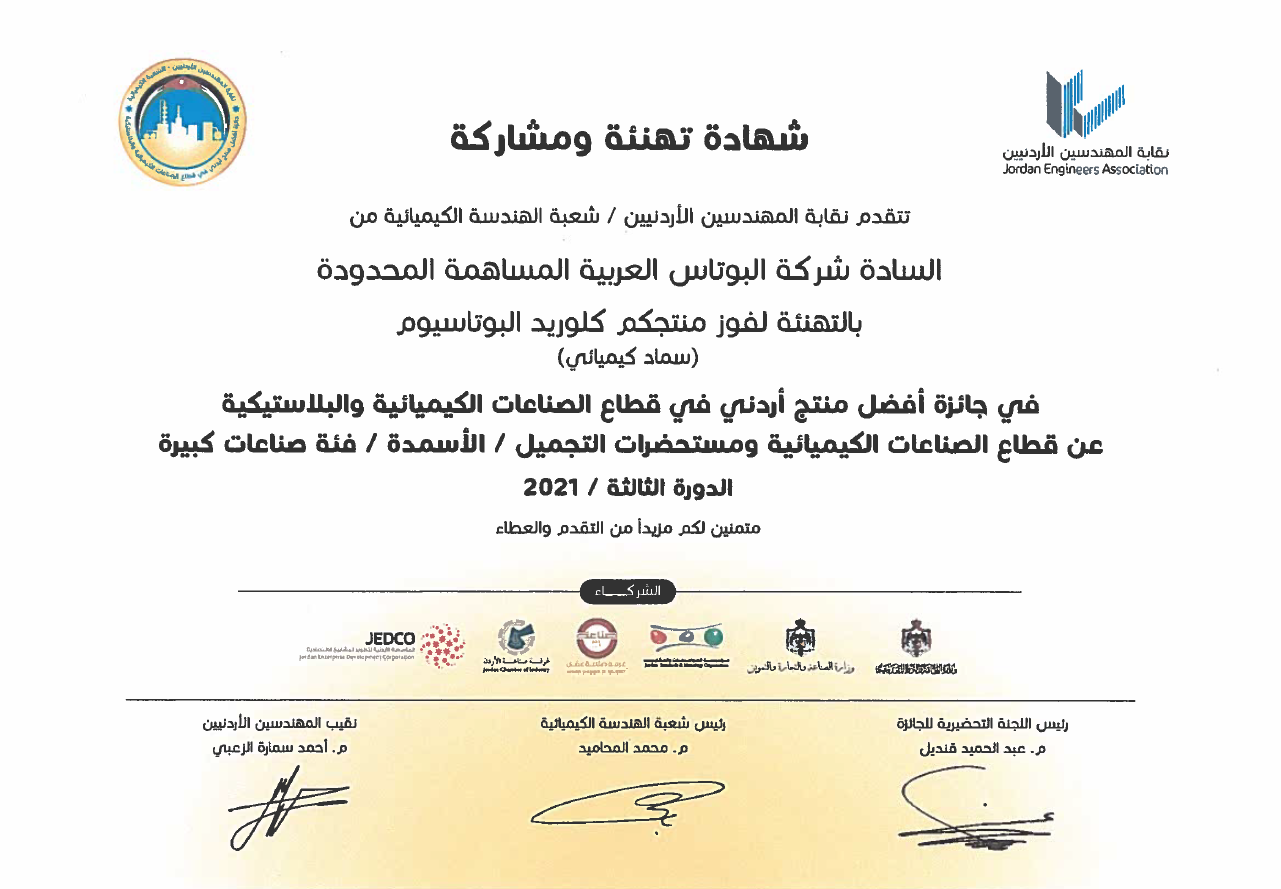 • Jordan Best Product: APC was awarded the Best Jordanian Product Award in the Chemical and Plastic Industries Sector in 2024 in recognition of APC’s high-quality products, after having obtained it in 2018 and 2022. The award is organized by the Jordan Engineers Association and the public sector.